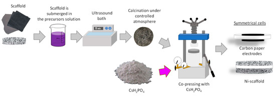Disk samples used for electrochemical measurements with a diameter of 13 mm were performed by uniaxial pressing. Electrodes based on Ni substrates or carbon paper were attached to both sides of the electrolyte by co-pressing the synthesized materials and two Ni substrate or carbon paper in a sandwich cell configuration, as can be observed in Figure 1.