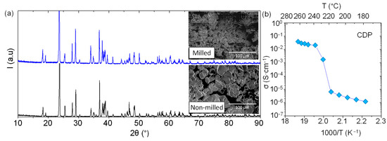 (a) X-Ray diffraction of cesium dihydrogen phosphate, CsH2PO4, (CDP) before and after milling 4 days and scanning electron microscopy (SEM) micrographs of CDP after synthesis and after milling. (b) Electrical conductivity measurements of CDP as function of temperature, with a content of 30% of water in N2.