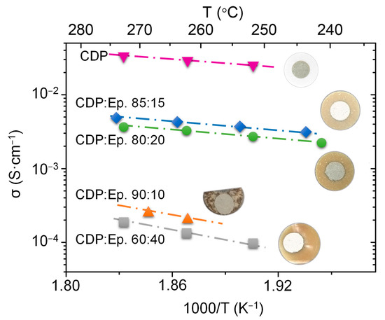 In this study, the composite prepared by mixing CDP and epoxy with different percentages of weight were characterized by electrochemical impedance spectroscopy in order to re-evaluate the optimized weight ratio between CDP and epoxy in the literature [17], and for that purpose, silver paste (P-100, Elcoat) electrodes were applied. Argon with a partial pressure of 0.3 bar of water was used for the EIS measurements. Results of the conductivity obtained from EIS measurements are shown in Figure 3. As can be inferred from the graph, when CDP is mixed with the epoxy the conductivity is reduced, the pure CDP exhibits the highest conductivity. The total conductivity of the electrolyte is reduced two orders of magnitude when high contents of epoxy (CDP:epoxy, 60:40) are incorporated in the electrolyte, and in the same manner, high contents of CDP have the same impact in the total conductivity. In the first case, the quantity of epoxy is too high, and proton pathways are limited due to the negligible conductivity of the epoxy (CDP:epoxy, 90:10). In the second case, the low content of liquid phase in the mixture hampers the homogenization of the sample (Figure 3). However, the samples with 80 and 85% of CDP show the best results (Figure 3), and this observation is in good agreement with the literature [16] due to the use of the identical epoxy resin.