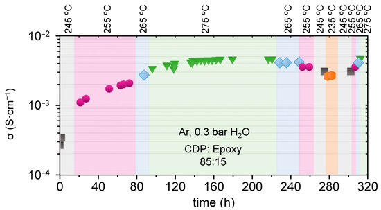 The material which exhibits the highest conductivity (CDP: epoxy 85:15) was characterized during a long period of time, and results are presented in Figure 4. A stabilization period of few days is observed for samples after running the test; conductivity increases with time until a steady state is reached, and after that, temperature variation does not affect the material stability (Figure 4). As a result, for long periods of time, composite electrolytes present higher stability than bare CDP material working as electrolyte [5,17].