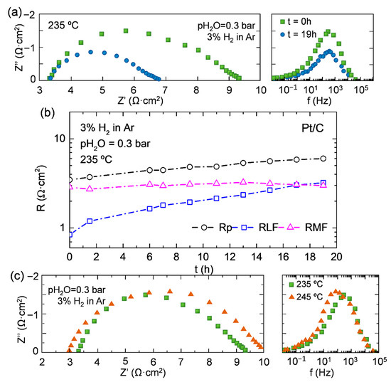 (a) Nyquist’s and Bode’s plots of carbon paper and (b) resistances obtained from equivalent electrical circuit fitting results of Pt on C paper symmetrical cell at 235 °C as function of time. (c) Nyquist’s and Bode’s plots of carbon paper with Pt as a function of temperature.