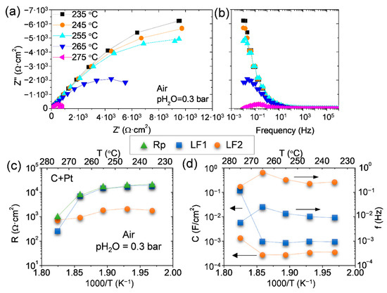(a) Nyquist’s and (b) Bode’s plots and equivalent electrical circuit fitting results; (c) resistance and (d) capacitance and frequency of Pt on C paper symmetrical cell as function of temperature in air conditions with pH2O = 0.3 bar.