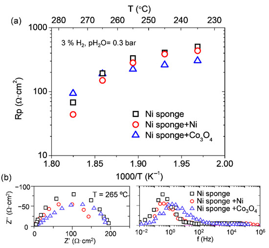 (a) Polarization resistance of the three different electrodes: Ni sponge, Ni sponge + Ni, and Ni sponge and Co3O4 electrodes as function of temperature. (b) Nyquist’s and Bode’s plot of electrodes at 265 °C.