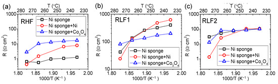 Bare Ni sponge and infiltrated electrodes (Ni and Co3O4) were tested as electrodes in the same conditions tested for the Pt electrodes (3% H2 in argon with pH2O = 0.3 bar). The overall polarization resistance of the three different electrodes is plotted in an Arrhenius arrangement in Figure 8. The three electrodes have two different activation energies, one below 265 °C and another at higher temperatures.
