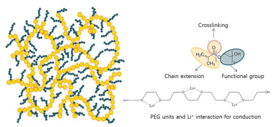 Poly(ethylene glycol) methacrylate (PEGMA, 500 Da) was purchased from Sigma-Aldrich (Seoul, Korea), and a commercial liquid electrolyte used was LiPF6 (1.0 M) with ethylene carbonate (EC)/ethyl-methyl carbonate (EMC) (1:2 vol) supplied from Panax Etec (Seoul, Korea). A commercial polyethylene (PE) battery separator (15 µm in thickness) was kindly supplied by Samsung Advanced Institute of Technology (SAIT, Suwon, Korea). Aluminum packs were purchased from Wowpack (Seoul, Korea) and used to shield the outside air during the electron beam irradiation. All chemicals were used as received.