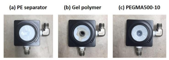 where the A0 and A1 are the area of the membrane before and after treatment [39]. In addition, a pressure-loaded blister test was carried out to analyze the mechanical durability of the commercial PE separator, pure gel polymer, and gel polymer electrolyte reinforced membrane (GPERM). Figure 2 shows the structure of the pressure-loaded blister test cell and a picture of it after the test. Air is injected by fastening the membrane to be tested for durability inside as shown in the figure. The analysis is carried out by measuring the time until a 15% loss of the initially applied pressure occurs by momentarily applying specific pressure to only one direction after loading the same gas pressure on both sides of the measurement sample [40,41]. It is possible to evaluate the durability of the membranes in a relatively short time using this method. For the measurement conditions, feed gas air pressure of 0.5 bar with 30% RH relative humidity was applied and the experiment was repeated every 1 s at a temperature of 65 °C.