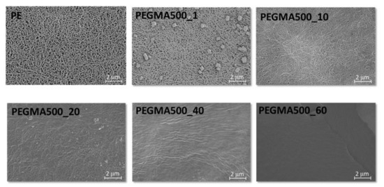 Figure 3 shows the SEM morphology of the GPERMs according to the changes in the concentration of PEGMA. Compared with the morphology of the commercial PE support, when 1 wt.% of PEGMA was used, it can be seen that somewhat uneven gelation occurs inside and outside the PE support due to the low concentration. However, when 10 wt% or more of PEGMA is introduced, gelation begins to occur in the pore structure of the PE support, and when 40 wt% or more is introduced, it can be seen that gelation occurs not only in the pore structure of the PE support but there is excess gelation to cover the pores of the surface. This unique gelation method results in an increase in the thickness of the created gel polymer electrolyte reinforced membrane. Figure 4 shows the TEM morphology measured without a separate staining process for the gel polymer electrolyte reinforced membrane. Considering that a specimen with high electron density appears black in TEM analysis, the black color in each image indicates the distribution of lithium salt. As expected from the schematic diagram of the chemical structure network in Figure 1, the lithium salt was distributed in a dense form, and it was confirmed that it appeared in a pouch form. In addition, as seen from the high-magnification TEM image, it can be seen that the lithium salt inside each pouch is distributed in an even dispersion state. It was assessed that the evenly concentrated distribution of lithium salts inside the pouch would have a positive effect on ion conductivity.