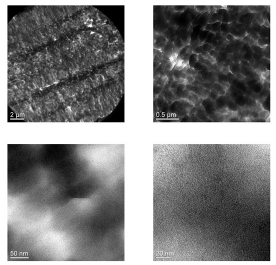 The surface morphology of the commercial PE separator and the gel polymer electrolyte reinforced membranes (GPERM) were observed by the mean of field emission scanning electron microscope (FE-SEM, Model JES-6701F, JEOL, (Tokyo, Japan). All the surfaces of the samples were coated with a thin Pt layer before SEM measurements. Moreover, the microstructure of the GPERs was studied using a transmission electron microscope (EF-TEM, Model LIBRA 120, Carl Zeiss, (Stuttgart, Germany) operated at an acceleration voltage of 120 kV. Before the measurement, it undergoes three pretreatment steps of fixation, drying, and embedding, and the fixed sample was finely cut using an Ultramicrotome (Model EM UC7, Leica, (Wetzlar, Germany) and placed on a grid for TEM analysis.