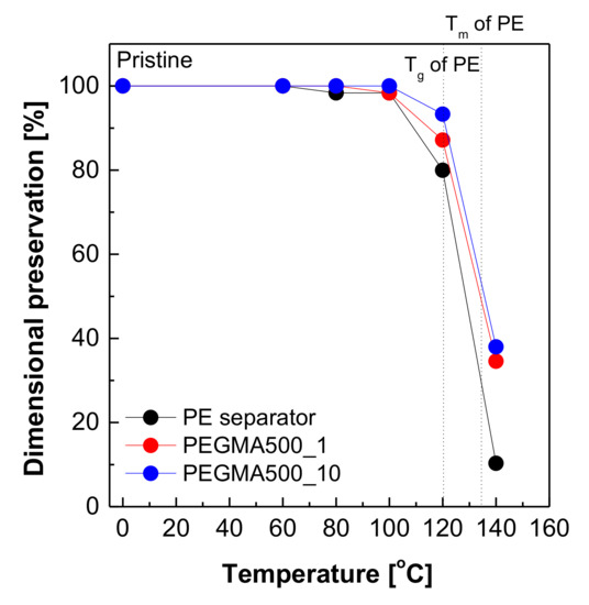 Figure 5 shows the change in the thermal shrinkage rate of the gel polymer electrolyte reinforced membrane. The commercial PE separator used as a support starts isotropic shrinkage from 80 °C near the glass transition temperature of PE polymer (~78 °C), as can be known from the intrinsic function of the separator, and up to 20% change in measurement occurs at 120 °C. On the other hand, for the gel polymer electrolyte reinforced membrane filled with gelatinized PEGMA in the pore structure, it begins to shrink from 100 °C, and for PEGMA500_10, it shows the lowest change in measurement (~7%) at 120 °C. This indicates that the moderate gel polymers can contribute to improving heat resistance when impregnated in a pore structure.