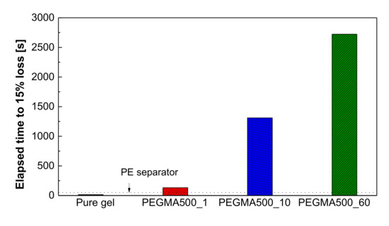 Figure 6 is the durability analysis result according to the physical acceleration of the gel polymer reinforced membrane. For the commercial PE separator, since it is a porous support, gas was not blocked but permeated as it is. The GPERM took 132 s to lose 15% at 1 wt.% concentration of PEGMA oligomer while it recorded a remarkably high value of 2723 s when the concentration of PEGMA oligomer was 60 wt.%. This proves that PEGMA oligomer was well impregnated into the pores inside the PE separator, which is a porous support, and was gelatinized by the electron beam. On the other hand, for pure PEGMA gel, it only took 15 s to lose 15%. It confirmed that the gel itself has weak mechanical durability without a support. The physical acceleration analysis proved that the GPERM has significantly higher kinetic and mechanical durability than the existing gel polymer. It is considered that such gel formation will effectively prevent the short-circuit phenomenon between electrodes caused by dendrite formation.
