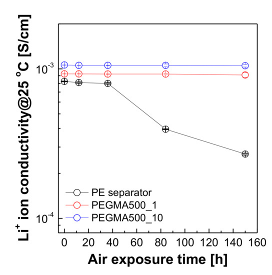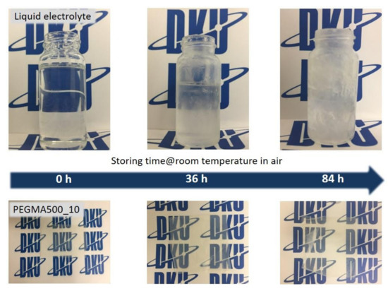 Figure 7 is an image of the change in the state of the liquid electrolyte and GPERM based on the storage time. Since the liquid electrolyte is a carbonate-based electrolyte containing LiPF6, it was confirmed that the organic solvent volatilized and the lithium salt crystallized over time. On the other hand, the gel polymer electrolyte reinforced membrane hardly lost its initial transparency over time, and no lithium salt crystallized. This is predicted to be due to the physical maintenance of the carbonate-based electrolyte solution containing lithium salt due to the effect of the pouch structure inside the gel, which is described above, and the strong chemical bond of lithium ions with the oxy-ethylene unit formed inside the gel [45]. Figure 8 is data on the change in lithium ion conductivity according to the different storage times. As observed in Figure 8, the lithium ion conductivity decreases over time due to the precipitation of lithium salts. This difference was more pronounced in the liquid electrolyte than in the gel polymer electrolyte. This result is presumed to be due to the large impact of the absence of lithium, which is responsible for conductivity, due to the precipitation of lithium salt in the liquid electrolyte, and because of contamination by the reaction of lithium and moisture. In conclusion, this was an opportunity to prove that the gel polymer electrolyte reinforced membrane is more stable against exposure to external air and moisture than the liquid electrolyte.