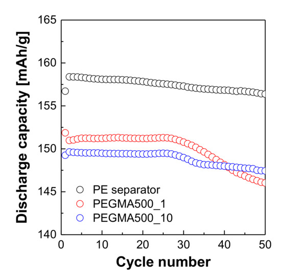 Figure 9 compares the cycle performance of coin cells with different separators and electrolytes. The coin cell with commercial PE separator and liquid electrolyte showed the highest initial discharge capacity and after 50 cycles at 1.0 C-rate, exhibited higher capacity retention (98.73%) than the other coin cells with the gel polymer electrolyte reinforced membrane. This appears to be a phenomenon caused by an uneven surface of the gel polymer that leads to an uneven interface with the electrodes. This phenomenon is more pronounced in PEGMA500_10 than in PEGMA500_1, in which the excessive growth of PEGMA oligomer in the thickness of PEGMA500_10 is thought to be negatively involved in the interfacial resistance with the electrode during charging and discharging. Even so, the coin cells with the gel polymer electrolyte reinforced membrane still show a relatively good capacity retention rate (>95%). It is thought that if PEGMA growth in thickness is controlled, the interface resistance with the electrode can be effectively reduced. In the meantime, the cycle performance of the coin cells will be improved.