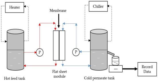 Set-up of direct contact membrane distillation (DCMD) operation process. The cross-flow membranes were carried out at constant temperature at feed and permeate sides for all the prepared membranes.