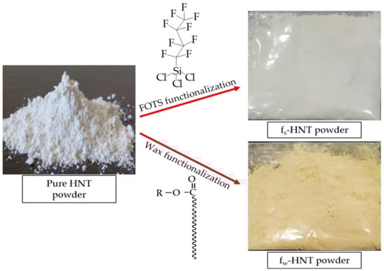 FOTS and carnauba wax were used according to the literature [] with a few modifications. The 5 g of HNT was stirred in 12.5 g n-hexane solution consisting of 5 wt.% FOTS for 24 h. The functionalized HNT was then separated and dried in a vacuum oven at 100 °C for 1 h. The white powder of functionalized HNT should be dried in a vacuum oven at 60 °C to 70 °C for 24 h before further experiments.