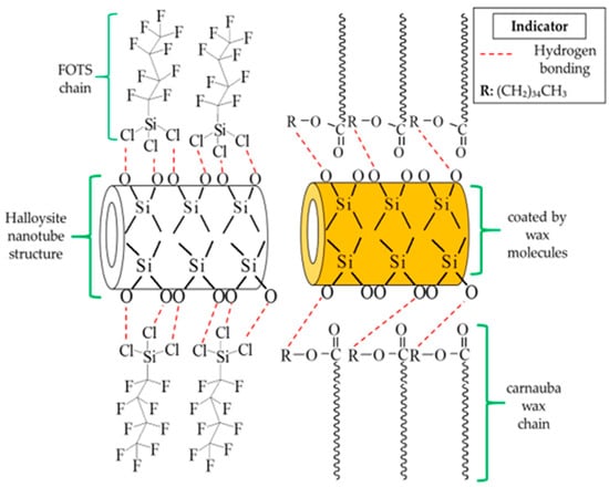 Illustration of proposed interaction of functionalized FOTS and carnauba wax with HNT. The hydrogen bonding takes places in both reactions of functionalized HNTs. The solid form of carnauba wax promotes the coating process on the surface of HNT particles. The functionalization process has facilitated the formation of hydrophobic HNT particles.