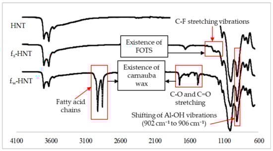 New functional groups of functionalized HNT particles using FOTS and carnauba wax. Carnauba wax functionalization shows a significant peak along the HNT spectra.