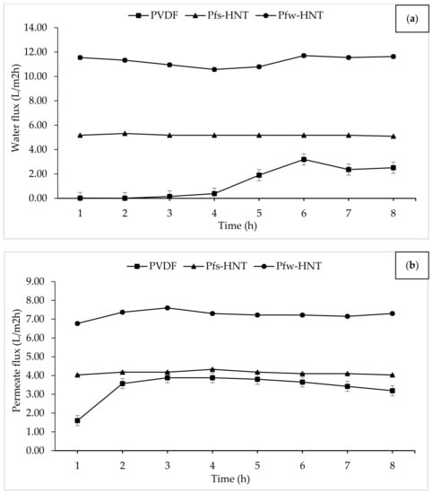 DCMD is one of the basic MD configurations. The DCMD involves the vapor pressure difference across the membrane pores. This operation creates a vapor pressure difference across the membrane through different temperatures by vaporization and condensation processes []. Therefore, the application of hydrophobic PVDF/HNT membranes were carried out to determine the water vapor permeability of the aquaculture wastewater. In this study, the effect of fs-HNT and fw-HNT particles on the PVDF membrane was investigated. From Figure 7, a significant improvement in flux permeation of the fabricated membranes was observed after the addition of functionalized HNTs. The permeation was investigated under a constant temperature of 60 °C and 20 °C at hot and cold sides, respectively. For the neat PVDF membrane, the flux was lowest because of the dense sponge-like pores of the inner layer that caused some barriers and indirect flow to water vapor permeation. Even though the neat membrane obtained the highest porosity and pore sizes, the high density and viscosity of the pure PVDF solution created a denser inner structure with the least thickness layer. This compact layer could retard the flow of water vapor throughout the MD process. In contrast with the Pfs-HNT membrane, the presence of this filler increased the viscosity of the polymer solution that led to a high membrane thickness without altering the percentage of membrane porosity. However, the thickness of the membrane layer had promoted only a slight increase from the neat membrane. The Pfw-HNT membrane obtained a significant increase of permeate flux for both feeds (water and real aquaculture seawater). The increased flux of the Pfw-HNT membrane compared with the PVDF and Pfs-HNT membranes was attributed to the improved hydrophobicity and enhanced interconnected fibrous-like structure. It could be implied that the alteration of the membrane structure was the vital factor for the membrane performance []. The dispersion of functionalized HNT particles in polymer solution is the main factor for the microstructure formation and membrane performance. When the content of functionalized HNT particles exceed the applicable amount, the coagulation of the particles slowed down and resulted in an increased membrane thickness (Pfs-HNT membrane) with a declination of membrane permeability.