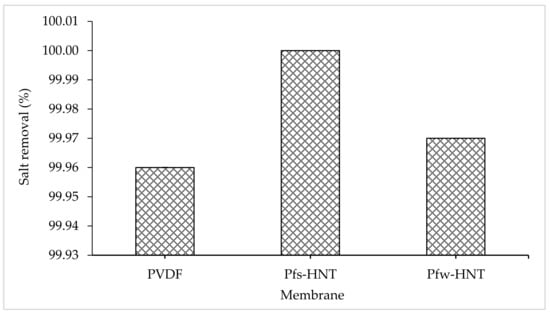 From the flux permeation graphs, the average flux of both water and aquaculture permeates had tabulated in Table 3. The average water flux obtained an ascending order of 1.32 L/m2h to 5.18 L/m2h and 11.26 L/m2h for the neat PVDF, Pfs-HNT and Pfw-HNT membranes, respectively. Meanwhile, the permeate flux showed some decrement to 4.14 L/m2h and 7.24 L/m2h for both functionalized HNT membranes, Pfs-HNT and Pfw-HNT, except for the neat membrane. The neat PVDF membrane observed an unstable permeability for a long continuous MD process (16 h), which was further identified by the standard deviation measurement. The resultant flux permeation was suggested due to the pore swelling phenomenon that increased the vapor permeation after 8 h of water feed []. This phenomenon could be related to the adsorption of ions from the salt solution onto the membrane surface with a consistence to the AFM analysis on the formation of valley morphology. The increasing salt concentration could increase the membrane charge density, which led to an increase or decrease of surface charge density depending on the adsorbed ions. Thus, a higher or lower concentration of counterions inside pores occurred to neutralize the surface charge, as this effect induced the electrostatic repulsions between counterions []. However, the addition of functionalized fillers had highly facilitated the flux stability with the standard deviation <0.5. The Pfs-HNT membrane obtained the most stable flux for both feeds with 5.18 L/m2h ± 0.06 and 4.14 L/m2h ± 0.10, respectively. Even though the Pfw-HNT membrane was less stable in flux permeation than the Pfs-HNT membrane, it is still applicable to use as the MD membrane as it achieved up to 11.25 L/m2h (water) and 7.24 L/m2h (permeate) with an insignificant difference in salt removal (>99%) as shown in Figure 8. The effect of functionalized HNTs has inhibited the pore swelling phenomenon, even the membranes exposed to the high salt concentration solution. Abdel-Karim et al. reported that the flux of PVDF MD membrane using reduced graphene oxide (rGO) had improved the flux by approximately 7.0 L/m2h []. It convinced the flux permeation of this study, which was applicable for the MD process with further improvement.
