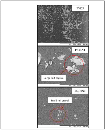 Even though the neat membrane obtained 99.96% of salt removal, the pore swelling phenomenon had led to the surface fouling due to the high adsorption of ions onto the membrane surface, as shown in Figure 9. The salt ions almost covered all the surface area of the membrane with the presence of white particles. This event might decrease the permeate flux with prolonged hours. Consequently, the pores wetting phenomenon might occur and reduced the membrane selectivity. In contrast with functionalized HNT membranes, the membrane surface of both membranes showed an anti-fouling behavior. The crystallization of large salt crystals was formed on the Pfs-HNT membrane and a few small crystals on the Pfw-HNT membrane. The mild salt scaling on both membranes could initiate an extended hour for the wetting phenomenon to occur compared to the neat membrane. The result showed that the Pfw-HNT membrane obtained an advantage property as an appropriate membrane for MD process.
