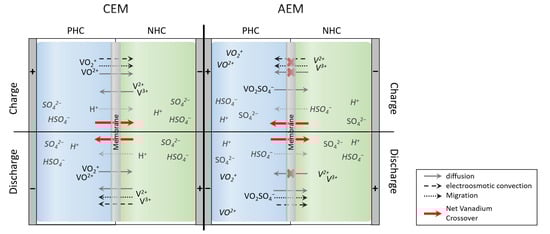 Based on the described crossover processes, the scheme in Figure 1 is considering the crossover of ions in dependence on ion exchange membrane type and state of operation (charge or discharge) of the battery in a simplified manner; water transfer is not considered. The transfer of water is caused by osmotic pressure, by the transfer of vanadium ions carrying water molecules bound within the hydrate shell and also by the charge balancing ions (protons, hydrogen sulfate) [,,,]. Ions with a high charge carry larger amounts of water molecules. Since the charge of vanadium ions as well as osmotic pressure depend on the SOC, the transfer of water also depends on SOC [,].