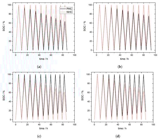 Figure 2c,d show simulated SOC in PHC and NHC for cases III and IV. The crossover direction is independent on the state of operation, VO (as VOSO) ions are crossing from PHC to NHC. Figure 2c refers to predominant crossover during charging whereas Figure 2d depicts predominant crossover during discharging. In both cases self-discharge occurs in accordance to Equation (10) in the NHC and the SOC for the charged NHC is decreasing from cycle to cycle.