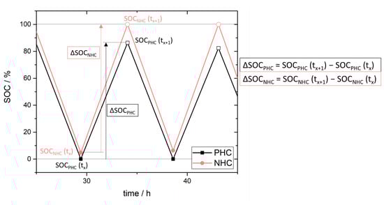 For predominant crossover processes from NHC to PHC (mainly occurring using CEM) the crossover impact on the SOC of the PHC is stronger due to self-discharge. Therewith the SOC range (SOC) for the charged and discharged PHC is decreased stronger than for the NHC and comparison of SOC ranges for PHC and NHC by putting them into relation as a ratio results in values < 1 (Equation (14)). For crossover processes from PHC to NHC (majorly occurring using AEM) the NHC suffers self-discharge. Hereby the crossover impact on the SOC range of the NHC is stronger and relation of SOC for PHC and NHC results in values > 1 (Equation (14)). Since SOC of the NHC and PHC is directly measurable as redox potential of the NHC and PHC electrolyte, estimation of SOC/SOC is quite simple to realize [].
