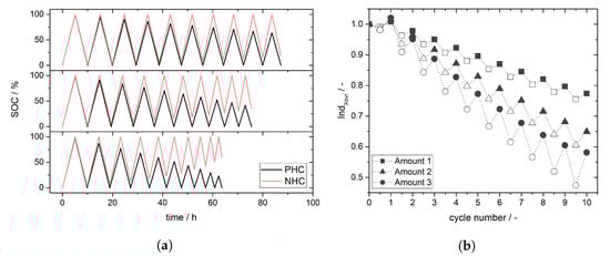 Figure 2a depicts the simulated SOC in the PHC and the NHC for case I. The crossover direction is set to be independent on the state of operation, V ions are predominantly crossing from NHC to PHC both during charge and discharge. Crossover is assumed to be stronger during discharging due to additional migration and electroosmotic convection of V. In accordance to Equation (7) self-discharge occurs in the PHC and the SOC for the charged PHC is decreasing from cycle to cycle. The self-discharge process during charging works opposed to the charge process. Already formed VO-ions are reduced to VO-ions and are theoretically available for further charging. However, since one V is formed per VO during charging, the NHC is fully charged while VO-ions remain in the PHC and the SOC for the charged PHC is decreasing from cycle to cycle. During discharging the lowered SOC of the PHC defines the completion of the process. Due to the self-discharge during charging a lower amount of VO-ions (PHC) is present compared to V-ions (NHC). In addition, the self-discharge during discharging promotes the discharge process in the PHC. Therewith a part of V-ions remain in the NHC and prevent a complete discharge, so the SOC of the discharged NHC is increasing from cycle to cycle. Overall, due to the crossover, the SOC range for both half-cells decreases from cycle to cycle.