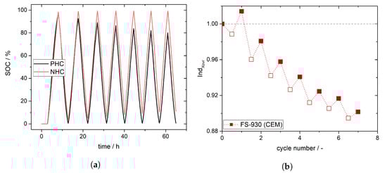 To reveal the applicability of the crossover index, experimental data for different membranes have been collected under various conditions (Table 1). Figure 6a represents the SOC calculated from half-cell OCP measurement in the NHC and PHC of a battery cell with a CEM (FS-930). The progression of the SOC for NHC and PHC depicts the predicted predominant crossover from the NHC to PHC in accordance to case I and II (Figure 2a,b). The crossover index Ind< 1 also testifies the expected direction of net crossover (Figure 6b). In contrary to the case studies in which the simulated crossover of vanadium ions has been assumed to be constant, (Figure 4), the difference between Ind for a charge half cycle and a discharge half cycle is not increasing from cycle to cycle but rather significantly decreasing. That means that crossover is decreasing from cycle to cycle. This is in accordance to the observed crossover behavior during application of ion exchange membranes in VFB; significant crossover of vanadium ions crossing can be observed for the first few charge and discharge cycles but stabilizes and decreases during cycling.