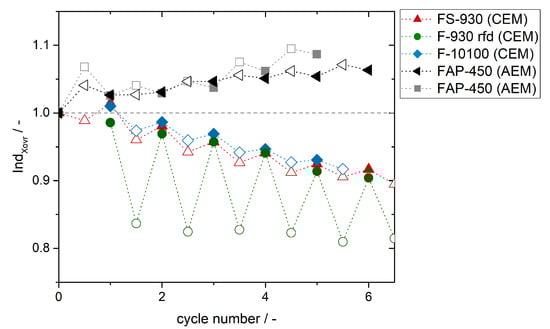 With membrane F-930 rfd the Ind for the charge half-cycles differ very strong from Ind for the discharge half-cycles. The difference is decreasing from cycle to cycle as described for the FS-930 membrane (Figure 6b). Despite comparable membrane thickness the difference between Ind for the charge half-cycles of the FS-930 and F-930 rfd is significant whereas the differences between the Ind for the discharge half-cycles for the FS-930 and F-930 rfd are only small. This might be caused by different material properties (short side chains in FS-930) and also different ion exchange properties; e.g., crossing of VO, concurrent with comparable thickness of the membranes.