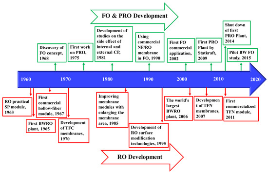 Timeline of the key developments of RO [16,17,18,19,20,21], forward osmosis (FO), and pressure-retarded osmosis (PRO) [22,23,24,25,26,27,28,29,30] processes.