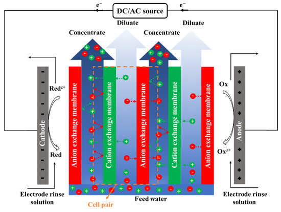 ED is operated in continuous, batch, and feed-and-bleed modes [256]. The continuous mode is suitable for a large-scale ED, while the batch mode is appropriate for small- or medium-scale processes [257]. In the feed-and-bleed mode, the desalinated or concentrate streams are partially recycled back to the feed solution to control the salinity of the product water [258]. This operating mode results in a higher water recovery and is applicable to medium- and large-scale processes [218,258]. These processes are operated at either constant potential or constant current density [259].