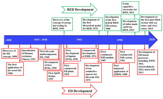 Timeline of the key developments of ED [9,121,218,221,223,224,225,226,227,228,229,230] and reverse electrodialysis (RED) [231,232,233,234,235,236,237].