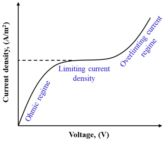 ED is operated at sub-limiting, limiting, and over-limiting current regimes as illustrated in Figure 7 [260]. In sub-limiting regimes, current density increases linearly with imposed potential. Due to the permselectivity of IEMs, CP forms in channels and develops along the cell. Once the concentration of ions at the membrane–solution interface in the diluate channel approaches zero, the current density reaches a limiting value, shown as a plateau in Figure 7. Further increasing the cell potential beyond the limiting value promotes a series of phenomena including gravitational convection, water splitting, co-ion leakage, and electroconvection in the cell, leading to the over-limiting of the current density and a transition to a linear increase in current density with cell potential [261,262]. The enhanced turbulence in the over-limiting current regime may result in mechanical instability. Additionally, a higher degree of water dissociation at higher potentials may lead to drastic pH changes, increasing salt precipitation and membrane scaling. ED units are typically operated at 80% of the limiting current density to avoid such consequences and to control the operational energy costs [263].