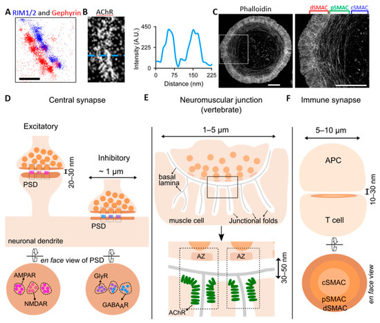 In this review, we focus on the nanoscale structures of the central synapses in the nervous system, the NMJs between motor neurons and muscle cells, and the immune synapses. Previous studies on these synapses with confocal microscopy and EM, including freeze-fracture, have also provided enormous information on their (ultra) structures [36,37,38]. Here we discuss the recent discoveries in the ultrastructure of these synapses as analyzed in particular through the more recently developed SRFM technologies. By illustrating the similarities in the nanoscale organization of these different types of synapses, we argue that a common structural basis of synapses may exist for cell-to-cell communication and that researchers can find inspirations by comparing these different types of synapses.
