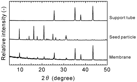 XRD patterns of the support tube, seed particles, and zeolite membrane.