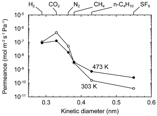 Figure 4 shows the influence of the kinetic diameter on the single-component gas permeance at 303 and 473 K. The permeance of CO2 was 5.1 × 10−7 mol m−2 s−1 Pa−1 at 303 K. The permeance, except for H2, decreased, with increase in the diameter, and that reached 4.1 × 10−11 mol m−2 s−1 Pa−1 for SF6. The diameter of the crystallographic channel aperture of the CHA-type zeolite is 0.38 nm [23], and the molecular diameters of H2, CO2, N2, CH4, n-C4H10, and SF6 are 0.289, 0.33, 0.364, 0.38, 0.43, and 0.55 nm, respectively [40]. Since H2, CO2, and N2 molecules are smaller than the channel diameter, those molecules can penetrate into and diffuse within the zeolite channels. Although the molecular diameter of SF6 is clearly larger than the channel sizes, SF6 was detected on the permeate side of the membrane. The marginal permeance of SF6 proposes that the membrane had intercrystalline boundaries. The unit cell of the high-silica CHA-type zeolite was shrunk by the air calcination, and the volume shrinkage degree was 0.6 vol % [37]. The small intercrystalline boundaries were produced by the unit cell shrinkage by the air calcination.