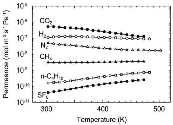Figure 5 shows the effect of temperature on the permeances of the single-component H2, CO2, N2, CH4, n-C4H10, and SF6 at 303–473 K. The permeance of CO2 was 5.1 × 10−7 mol m−2 s−1 Pa−1 at 303 K and decreased with temperature. As a result, it was 1.3 × 10−7 mol m−2 s−1 Pa−1 at 473 K. The permeances of H2 and N2 showed similar dependencies. Since these molecules are smaller than the channel diameter of the CHA-type zeolite, these molecules can adsorb on the zeolite channels. The adsorption amount decreased with temperature. Therefore, the permeances of H2, CO2, and N2 were decreased with temperature by the reduction of the concentration difference between both the sides of the membrane.