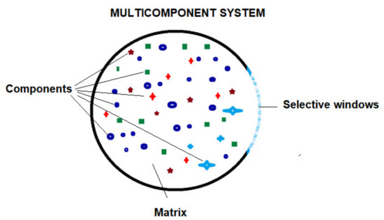 If we focus on membrane processes, it can be stated that the membrane is a window of a multi-component system (Figure 2), with selective permeability for chemical species of the system. Regardless of the nature or state of aggregation of the membrane material, the defining characteristic of the membrane is its semi/selective permeability [24,25,26,27]. This means that the chemical species that make up the system can come out only directed or controlled, through the window (membrane).