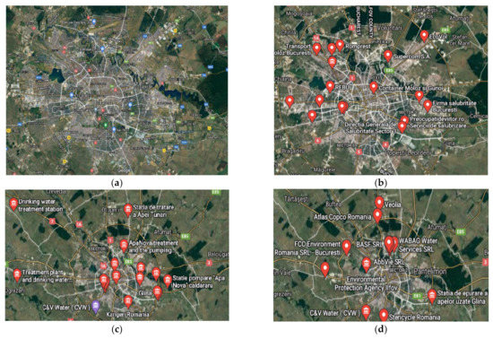 The Bucharest metropolitan area and its foul-smelling gases’ pollution sources: (a) the metropolitan area; (b) the location of main municipal waste processing and recovery centers; (c) locations of water treatment plants; (d) agencies and associations involved in environmental issues.