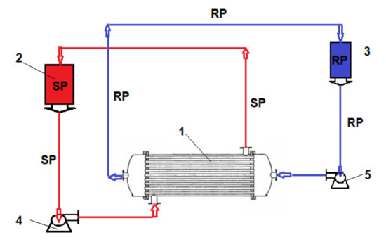 Operation scheme presentation with the pertraction module: SP—source phase; RS—receiving phase. (1) Hollow fiber pertraction module; (2) SP reservoirs; (3) RP reservoirs; (4) SP pump; (5) RP pump.