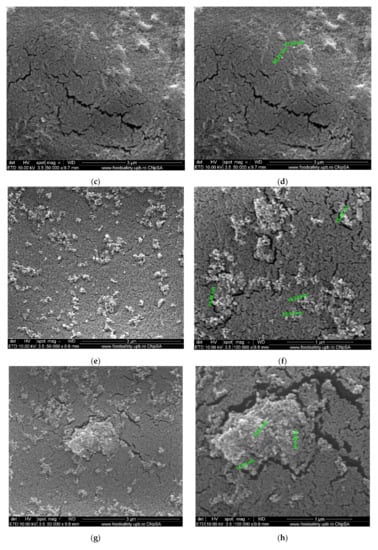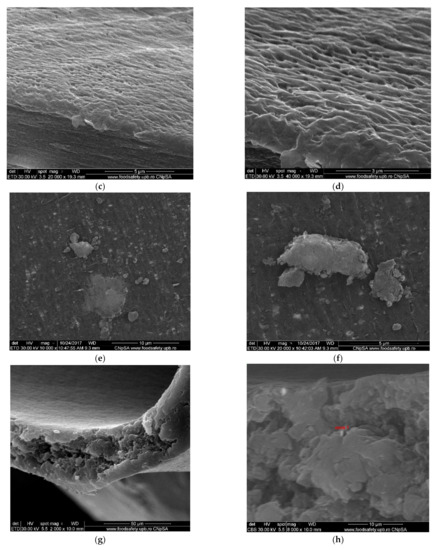 SEM morphology of the membranes: (a) membrane support (PPMS); (b) membrane support (PPMS) detail; (c) impregnated membrane (Ag-Cell-Ac-PPM); (d) impregnated membrane (Ag-Cell-Ac-PPM) detail; (e) processed impregnated membrane (Ag-Cell-Ac-PPM); (f) processed impregnated membrane (Ag-Cell-Ac-PPM) detail; (g) cross-section on Ag-Cell-Ac-PPM; (h) detail of the cross-section on Ag-Cell-Ac-PPM with the evidenced Energy Dispersive X-Ray Analysis (EDX) zone.