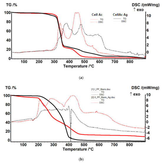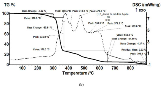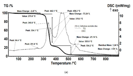 Thermal characterizations were performed using a Netzsch Thermal Analyzer (NETZSCH-Gerätebau GmbH, Selb, Germany). The thermal analysis was run in a nitrogen atmosphere at a 10 °C/min heating rate, from room temperature (25 °C) up to 900 °C.