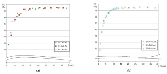The extraction efficiency (EE%) for the species of interest using the concentration of the solutions [80] was calculated as follows: