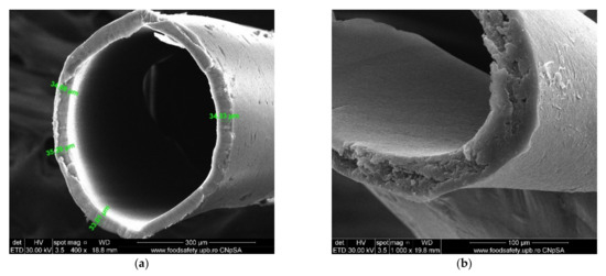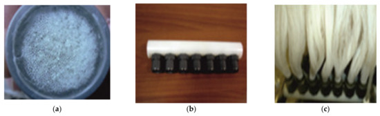 The commercially available capillary hollow fibers support (PPSM) was made from surface-modified polypropylene (PP) to provide optimal porosity (Table 1) [74]. For impregnation of the capillary bundle, they were placed in a U-shape. Then the crevices were immersed for 4 h in a 2 L cylindrical vessel containing the 1.5 L prepared 2%, 4%, and 6% Ag-cellulose acetate solution in methylene chloride: methanol solution at a volume ratio of 2:1. The membranes were removed and suspended for 24 h in a niche with laminar airflow to remove the polymer solution from outside the capillary walls (Figure 4).