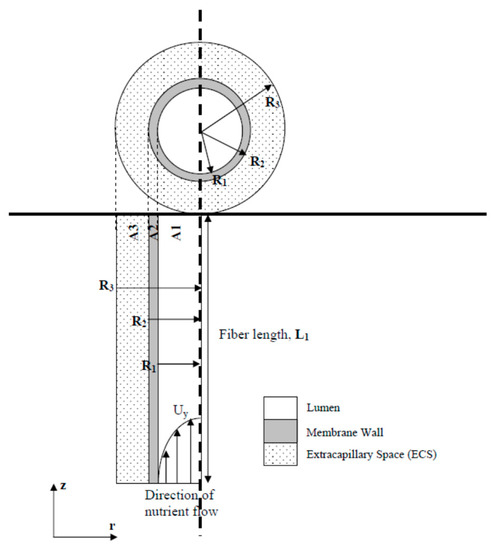 It should also be noted here that the HFMB is a perfusion-type bioreactor, which implies that the nutrient transport to the cells is governed by the convection and diffusion of the nutrients in the membrane lumen (hollow capillaries) and diffusion of the nutrients in cell culture media (CCM) through the lumen membrane and the ECS. A schematic diagram that represents the HFMB is presented in Figure 1. It has been reported in earlier publications (e.g., [5]) that the nutrient transport can be enhanced within this type of bioreactor. In addition, it has been observed that high cell density can be achieved in HFMB, (e.g., see [9]), which suggests that a mammalian cell density of the order of 108 cells/mL may be achieved in HFMB, which is close to the cell density in bone tissue. While these studies point toward the success of HFMB as a system for growing bone tissues, there are still shortcomings in our fundamental understanding in the behaviour of nutrients, oxygen as well as waste product transport through the HFMB. Therefore, these systems should be subjected to continuous in-depth investigations in order to determine their true diffusion performance [10,11,12].