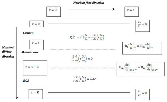 Non-dimensionalisation is very helpful in finding a group of parameters that are needed for the modelling process [29]. To reduce the number of parameters and simplify the model, the glucose transport equations are defined in terms of non-dimensionalised parameters with the parameters shown in Table 3. In addition to Table 3, the demonstration diagram for the dimensionless governing glucose transport equations and boundary conditions for the first-order cell kinetics in lumen, membrane, and ECS regions is shown in Figure 4.