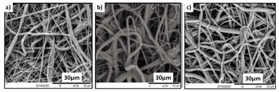 Scanning electron microscope (SEM) micrographs of the surface morphology of the electrospun scaffolds: (a) sample 1, (b) sample 2, (c) sample 3.