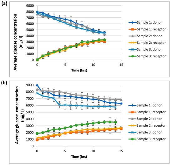 With the same electrospun scaffolds, the glucose diffusion experiments were carried out to study the glucose diffusion process in water and CCM. Figure 7 shows the trend of glucose concentration changes for both donor and receiver chambers in both water (Figure 7a) and CCM (Figure 7b). From observing the behaviour of the glucose concentration changes in Figure 7, it can be noted that the glucose concentration decreased in the donor phase and increased in the receiver phase. This confirms that the glucose molecules diffuse from a high concentration to relatively low concentration location until it reaches the equilibrium state. This can be related to the concentration difference between these two phases that led to weaker driving force for the glucose molecules. The utilized membranous scaffolds are supposed to act as resistance for the glucose diffusion; however, glucose can still diffuse through membranes and scaffolds, which means that these membranes possess a lower diffusion coefficient.