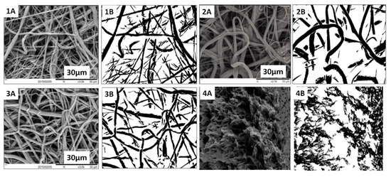 Typical original and black and white SEM images for (1A,1B) sample 1, (2A,2B) sample 2, (3A,3B) sample 3 and (4A,4B) polyvinlyidene fluoride (PVDF) membrane (commercial membrane).