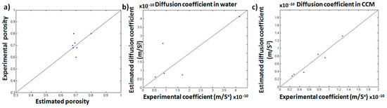 Scatter plots comparing the experimental and estimated results for (a) porosity, (b) diffusion coefficient in water, and (c) diffusion coefficient in CCM.
